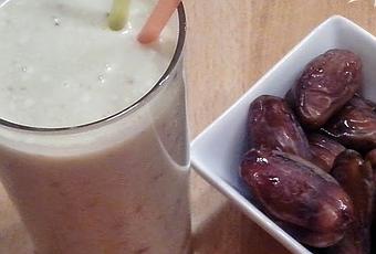 Limpiamos el aguacate, quitamos los huesos de los dátiles y troceamos el plátano. Todo esto lo metemos en la batidora eléctrica junto con la leche.