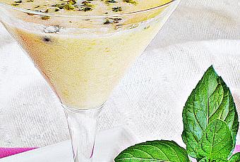 Servir en una copa , añadir unos pistachos troceados por encima y laminas finas de jengibre confitado. Adornar con una hoja de menta y las bolitas de mango ensartados en una palillo.