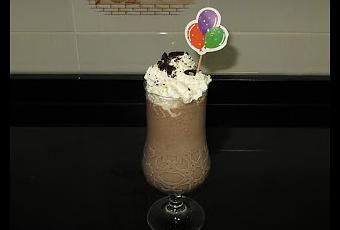 En el vaso de la batidora echamos el helado de vainilla, que se puede sustituir por uno de chocolate, las seis galletas oreo, los 50 gramos de chocolate con leche, la cucharada de cacao en polvo y la leche. Batimos hasta que todos los ingredientes se han mezclado.