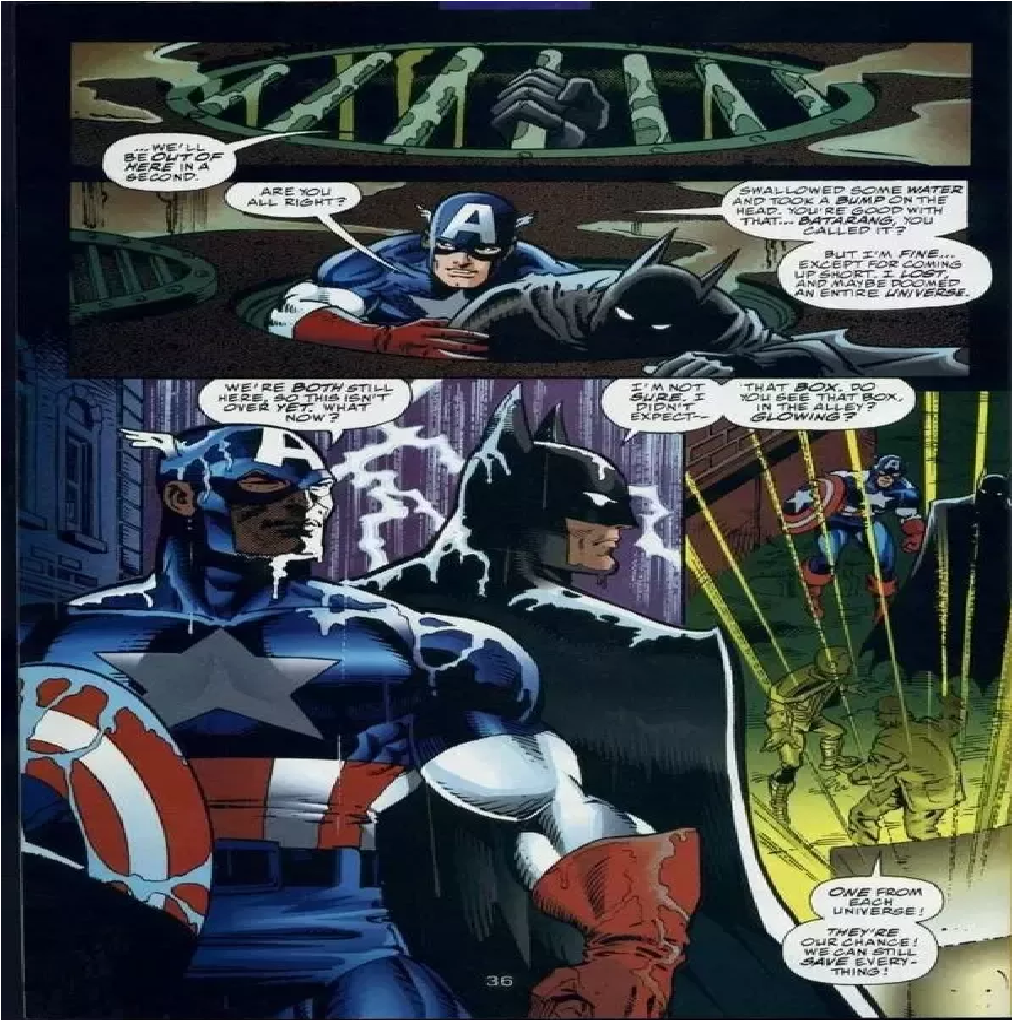 En una parte del comic, el Capitán América dice a Batman que él no es el enemigo, que solo son peones de un esquema más grande. Batman por su parte le afirma que es concebible que el Capitán América lo pueda vencer pero le tomará mucho tiempo lograrlo.