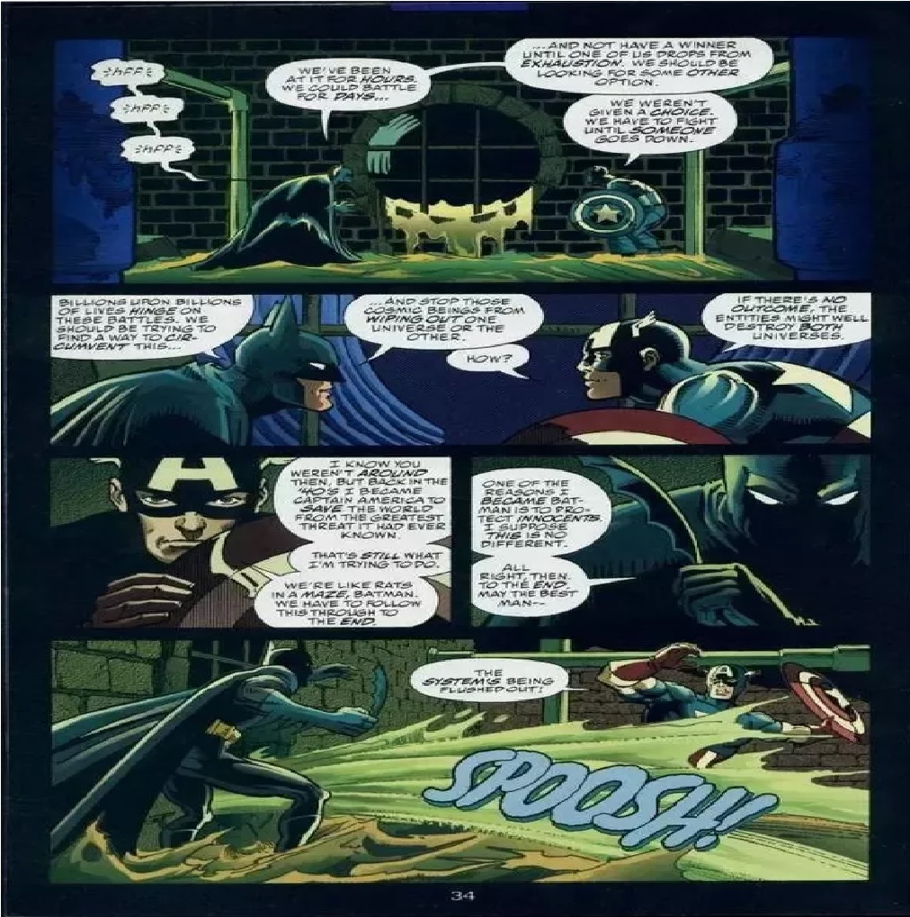 En dicho cruce entre DC y Marvel Comics, no hay restricciones, pero por decisión de ambos, la pelea termina igual en una acción que encuentra al Capitán América no tan fatigado como Batman debido a su excepcional resistencia.