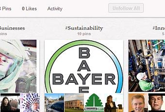 El perfil de Bayer en Pinterest incluye cuatro divisiones en las cuáles se pueden seguir cuatro áreas distintas de la compañía: salud, nutrición, y materiales de alta tecnología.