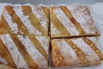 Preparación: Estirar el hojaldre, dándole forma cuadrada o rectangular y dividir en dos partes. . Colocar una base en una bandea de horno forrada con papel y cubrir la superficie, dejando por los bordes un espacio, con el cabello de ángel. Colocar encima la otra parte del hojaldre y cerrar bien los bordes. Marcar con el dorso de un cuchillo las porciones para que no lleguen a cortarse, sólo marcarse. Pinchar por varios sitios, pincelar con huevo y salpicar con granillo de almendra (opcional) Cocer en el horno a 190º C aproximadamente durante 20-30 minutos, hasta que esté hecho. Retirar del horno, dejar enfriar ligeramente, ya que puede tomarse totalmente frío o templado. Salpicar con azúcar glas, formando bandas o bien abrillantar ligeramente con gel de pastelería .