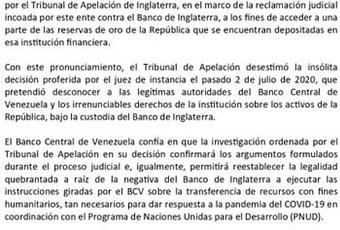 A través de un comunicado, el Banco Central de Venezuela reafirmó la decisión adoptada por el Tribunal de Apelación de Inglaterra que anuló el fallo del pasado 2 de julio, que otorgaba al diputado Juan Guaidó el control sobre el oro del país suramericano depositado en el Banco de Inglaterra, y espera que el proceso termine autorizando al Gobierno el acceso a los recursos.