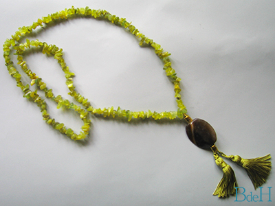 Es un collar-joya realizado con pequeñas gemas de jade color lima que acaban en una bonita ágata en tono “café” y se remata con dos borlas color verde lima.