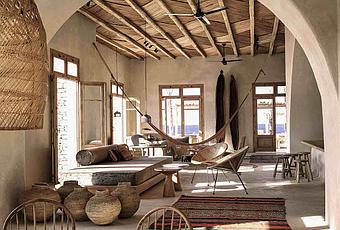 El centro del club es la edificación en piedra blanca lavada y desgastada por el clima, con una gigantesca terraza en varias alturas. Un ambiente muy muy cool, que evoca el glamour griego de los años 60. De estilo bohemio y relajado, las fibras naturales y la artesanía local son las protagonistas de cada uno de los espacios, donde además encontrarás una playa privada y zonas reservadas.