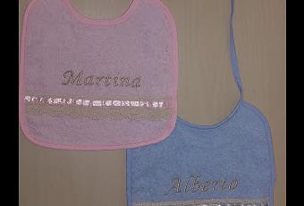 Baberos de felpa, prácticos pero elegantes... y personalizados con el nombre. Para Martina y para Alberto.