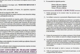 Concurso de Trabajos sobre las Personas con Discapacidad FísicaDesde los inicios de nuestra Asociación, en 1990, venimos convocando anualmente esta actividad consistente en proponer un tema sobre la discapacidad física para realizar un trabajo sobre el mismo para ahondar en algunos aspectos de su problemática. Dicho trabajo puede ser realizado por cualquier persona interesada en el tema, preferentemente estudiantes de la rama social, profesionales en la materia.etc.Al igual que la beca es a nivel nacional y se conceden tres premios económicos, pasando a propiedad de la Asociación aquellos trabajos que han sido premiados. Estos trabajos están cumpliendo año tras año los objetivos para los que se creó el concurso, ya que nos aportan visiones nuevas sobre la discapacidad e incorporan ideas nuevas para desempeñar con mayor acierto nuestra labor diaria, así como permiten que los participantes hablen y trabajen sobre el tema en cuestiónBases del Concursohttp://blogs.deusto.es/saludyaccionsocial/bases-xiv-beca-investigacion-y-xxv-concurso-trabajos-discapacidad-fisica-2014/