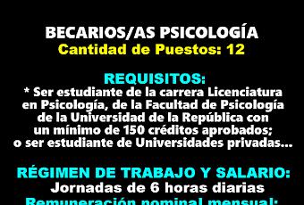 REQUISITOS DE LOS/LAS POSTULANTES (EXCLUYENTES)o Ser ciudadano/a natural o legal (Art. 76 de la Constitución de la República). En el caso de los/las ciudadanos/as legales podrán inscribirse aquellos que cuenten con la carta de ciudadanía expedida con tres años de antigüedad contados hasta el cierre del plazo de inscripción del presente llamado.o Tener como mínimo 18 años al cierre del plazo de inscripción.o Ser estudiante de la carrera Licenciatura en Psicología, de la Facultad de Psicología de la Universidad de la República con un mínimo de 150 créditos aprobados; o ser estudiante de Universidades privadas de carrera equivalente a la mencionada y reconocida por el Ministerio de Educación y Cultura con un mínimo de 2do año aprobado o cantidad de materias equivalentes.o De resultar seleccionado/a, al ingresar deberá ser estudiante de alguna carreramencionada anteriormente.o No haber tenido anteriormente una beca o pasantía en el Estado.o Al momento de la contratación, el/la postulante que resulte seleccionado/a, no podrá poseer cargo o función pública remunerada, excepto el de docente, en cuyo caso no podrá tener una acumulación horaria mayor a 60 horas semanales entre ambas actividades.o Al momento de la contratación, se considerará lo dispuesto por R 09.-1643 del 23 de diciembre de 2009 numerales 1°, 4° 7° y su modificación por R 25.-528 del 25 de junio de 2025 del artículo 1°A su vez no se aceptarán las inscripciones de quienes mantengan las definidas relaciones de parentesco, matrimonio o concubinato con algún miembro del Comité Evaluador. A través del formulario de inscripción accederá al texto del documento, debiendo indicar la opción que corresponda.o La inscripción se tomará como NOTIFICACIÓN, siendo responsable el/la aspirante de la veracidad de la información brindada.