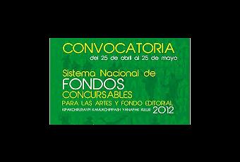El “Sistema Nacional de Fondos Concursables para las Artes y Fondo Editorial, 2012” es un proceso de asignación de recursos económicos que el Ministerio de Cultura del Ecuador entrega, previo concurso, a investigadores, creadores, artistas, gestores, organizaciones, grupos y colectivos culturales, para la ejecución de proyectos en las categorías de artes musicales y sonoras, artes escénicas, artes narrativas-literarias y artes visuales sin perder de vista su carácter interdisciplinario, con énfasis en los procesos de: a) investigación, b) creación, y, c) difusión-circulación, respectivamente. Para cada una de las categorías, el Ministerio de Cultura del Ecuador seleccionará y apoyará la ejecución de postulaciones que guarden relación de manera específica solo con uno de los siguientes ámbitos: “investigación”, “creación” y “difusión-circulación”. El monto máximo a adjudicarse será de ocho mil dólares (USD. 8.000,00) por proyecto, se entregarán un total de $436.0000.