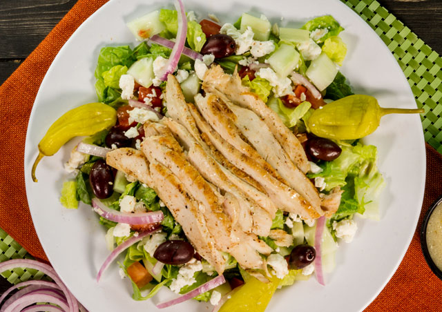 4 variedades diferentes de ensalada con pollo, por 6.99 $ o una Mediterránea por 8,99