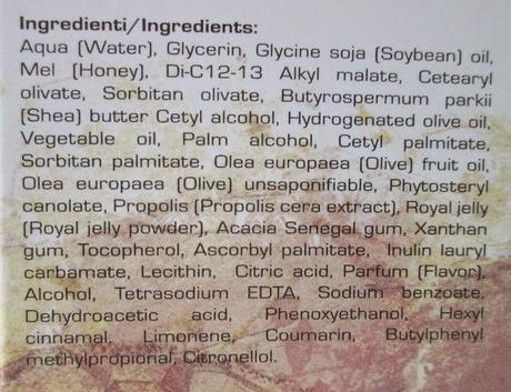 Tiene un olor muy rico y dulce, que me encanta... Supongo porque está enriquecida de miel, própolis, jalea real, manteca de karité, aceite de oliva y vitamina E.