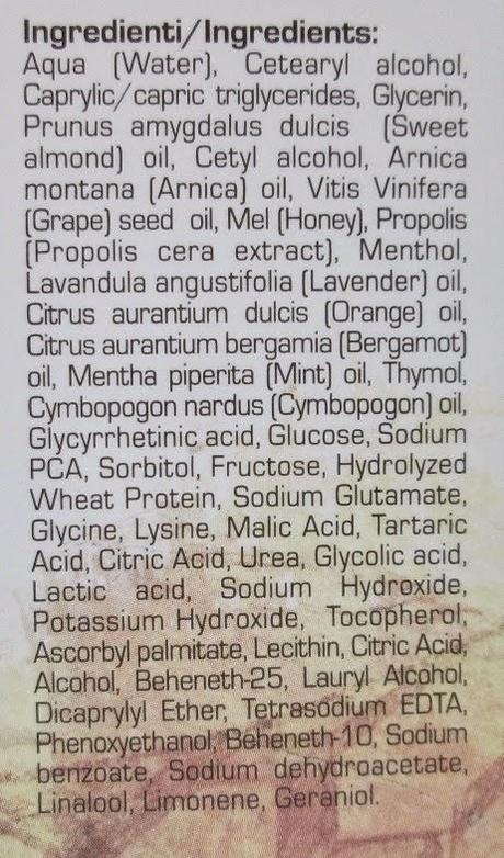 Tiene un olor dulcecito y muy agradable, que me recuerda un poco a vainilla..., sinceramente ¡¡me encanta!!. Supongo que es porque está enriquecida de miel, aceites de almendra, uva y árnica, timol y aceites esenciales.