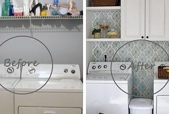 Este antes y después os puede resultar muy útil ya que los cambios son muy low cost. ¿Te recuerda a tu zona de lavado?Pues en este cambio solo han necesitado básicamente pintura de azulejos, pintura de pared con una plantilla, un mueble de almacenaje y una lámpara reciclada.¡Toma nota!