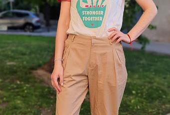 La camiseta es de La Casita de Wendy, pendientes Andrómeda de Fauna y Flora, colgante de Mediterraneo Art y zapatillas de Muroexe