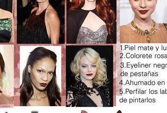 Se llevan los labios burdeos,granate,rojo oscuro...como queráis llamarlo.Este tono da un aire sofisticado y elegante y aunque también se lleva el estilo vamp(labios burdeos y ojos con un ahumado en negro),en esta tendencia solo se destacan los labios mientras que los ojos,con sombras naturales/eyeliner y máscara,quedan mas bien en un segundo plano.A mi me gustan ambos estilos,aunque no nos quedan bien a todas,siempre se dice que es mejor destacar solo uno,ojos o labios,y yo estoy de acuerdo,ya que destacar ambos a la vez desvía la atención del rostro y hace que los demás se centren en que vas maquillada.El colorete es apenas imperceptible,muy natural,casi se funde con el color de la piel.Es un maquillaje perfecto para la noche y no apto para tímidas¿O si?;)