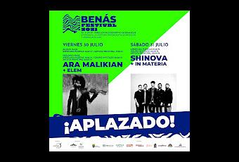 La edición 2021 del Benás Festival se aplaza debido a la actual situación con el Covid-19 y las restricciones comunitarias.El Benás Festival se aplaza, la edición 2021 estaba prevista para este fin de semana, ante la actual situación.El festival estaba previsto para realizarse entre el 30/7 y 31/7 en Benasque, Ara Malikian, Shinova, In Materia y Elem eran los proyectos previstos, pero ante las nuevas restricciones por el Covid-19 se aplaza. Os dejamos el comunicado oficial.