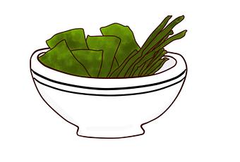 - Wakame: es de color marrón, tiene sabor dulce y puedes usarla en sándwiches como sustituto de la lechuga (aunque es el alga inseparable de la sopa de miso). También hay que dejarla en remojo 5 minutos.