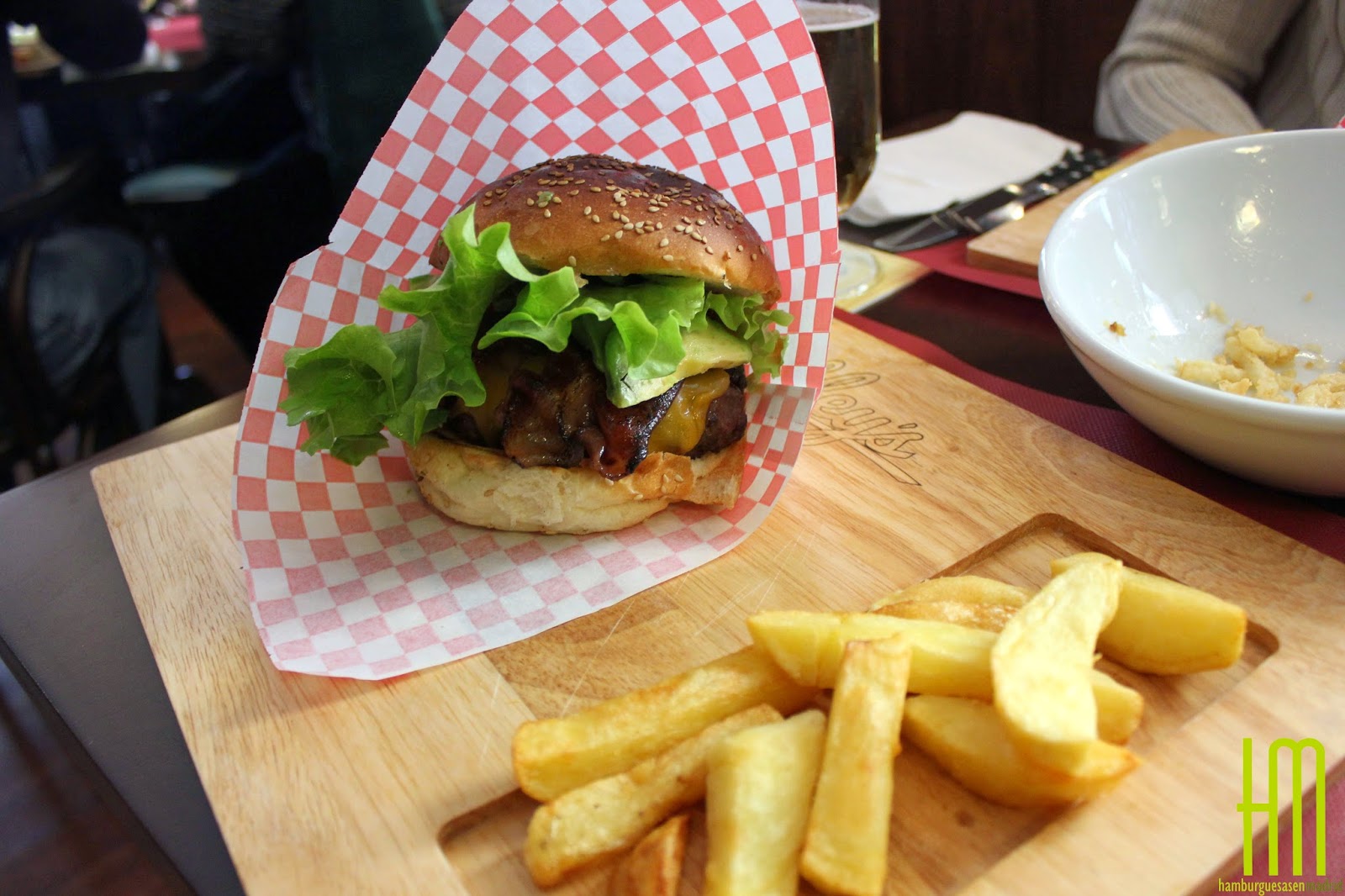 El servicio es algo irregular, ya que algún camarero puede llegar a ser demasiado simpático (lo de tocar y sobar al cliente nosotros no lo vemos) y otros demasiado perdidos, lo cual nos puede descolocar un poco, por lo que no podemos emitir un juicio de valor, sólo que, viendo el panorama, casi preferimos que no nos hagan caso a que nos soben como a una barra del metro.Al mirar la carta, vemos una propuesta interesante, quizás un poco corta de hamburguesas, pero simplista y completa, con entrantes y platos verdes además de los propios sólo aptos para los más carnívoros y las burgers, las cuales se nos ofrecen por tamaños, que van de los 200 gr. al kilo del que os hablamos antes. Y es que aquí sólo nos tenemos que preocupar por el tamaño, ya que se nos ofrecen escasamente cinco combinaciones de hamburguesas, desde la simple con queso y lechuga hasta la más exótica con trufa.