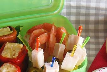 INGREDIENTES PARA MI CAJA DE BENTOBolitas de arroz cocido rebozadas unas de sésamo y otras de pipas.Tortilla de patata envuelta en pimientos rojos asadosLangostinos cocidosBrochetas de fiambre de pavo, aceitunas verdes y queso curadoSalsa de anchoas: Batir mayonesa casera con anchoas en aceite.