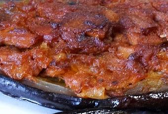 Cortamos las berenjenas por la mitad y le retiramos la carne. Esta la podemos utilizar en otra receta como para freírla en tempura o para una sopa.