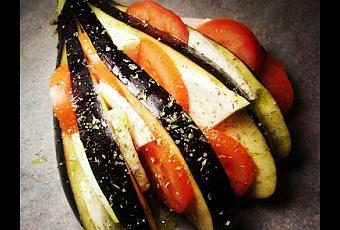 Se colocan entre las láminas de la berenjena. Le ponemos un poco de orégano, un hilito de aceite y un poquito de miel.