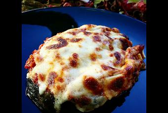 Ingredientes1 berenjena100g de fiambre de pavo rallado2 potecitos pequeños de queso burgos 0%2 cucharadas soperas de tomate concentradoCebolla molidaAjo molidoPimentón picanteMozzarella ralladaPreparación