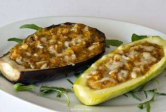Quería una versión de relleno para dos grandes protagonistas de nuestra huerta, que están ahora en plena temporada, aunque -como viene siendo habitual- las encontramos durante todo el año en los supermercados: berenjena y calabacín. Tenemos multitud de recetas para cocinarlos, pero una de las más aplaudidas es la de vaciarlas y rellenarlas de nuevo con un preparado a base de carne picada, que luego se recubre con bechamel y queso rallado, para terminar con un gratinado. Esa receta es la más común.