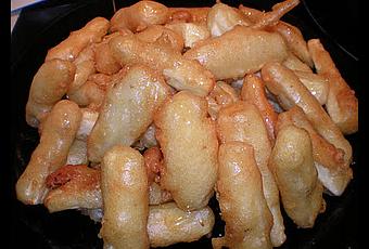 Ingredientes: 2 berenjenas, 150grs harina, 200ml cerveza, 7grs levadura en polvo, sal, pimienta, miel y acetite (para freír).Pelamos y cortamos las berenjenas en palitos. Salpimentamos y los reservamos.