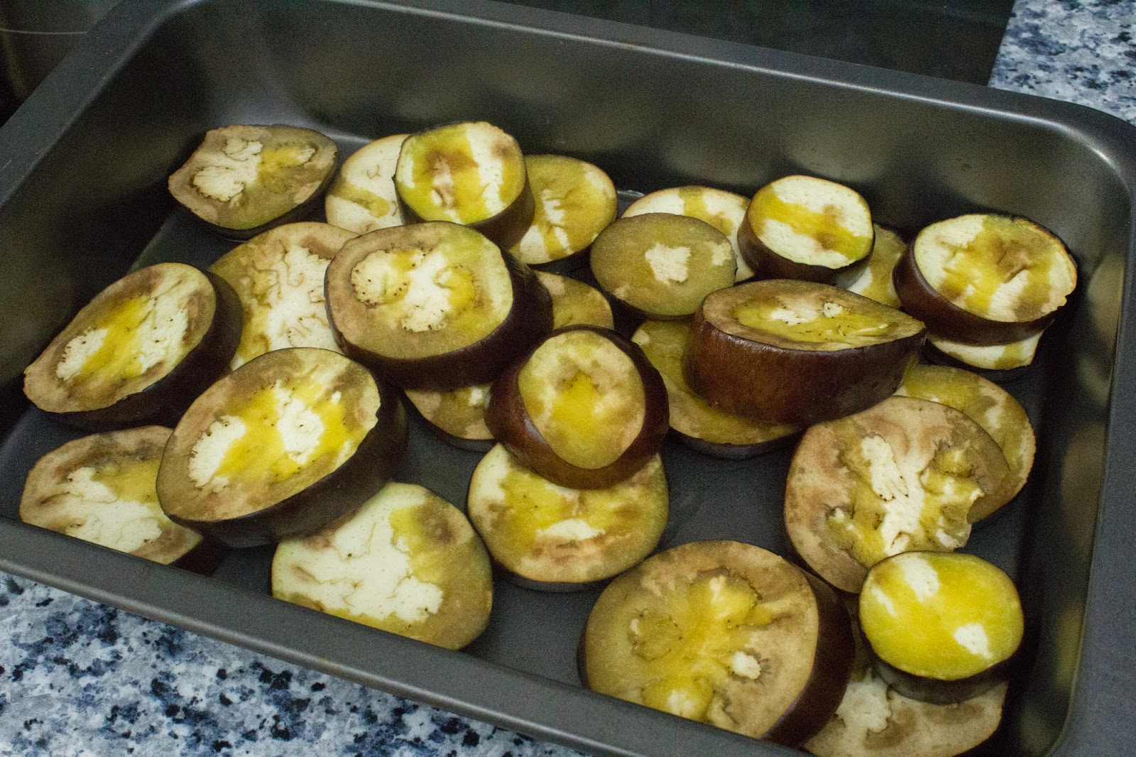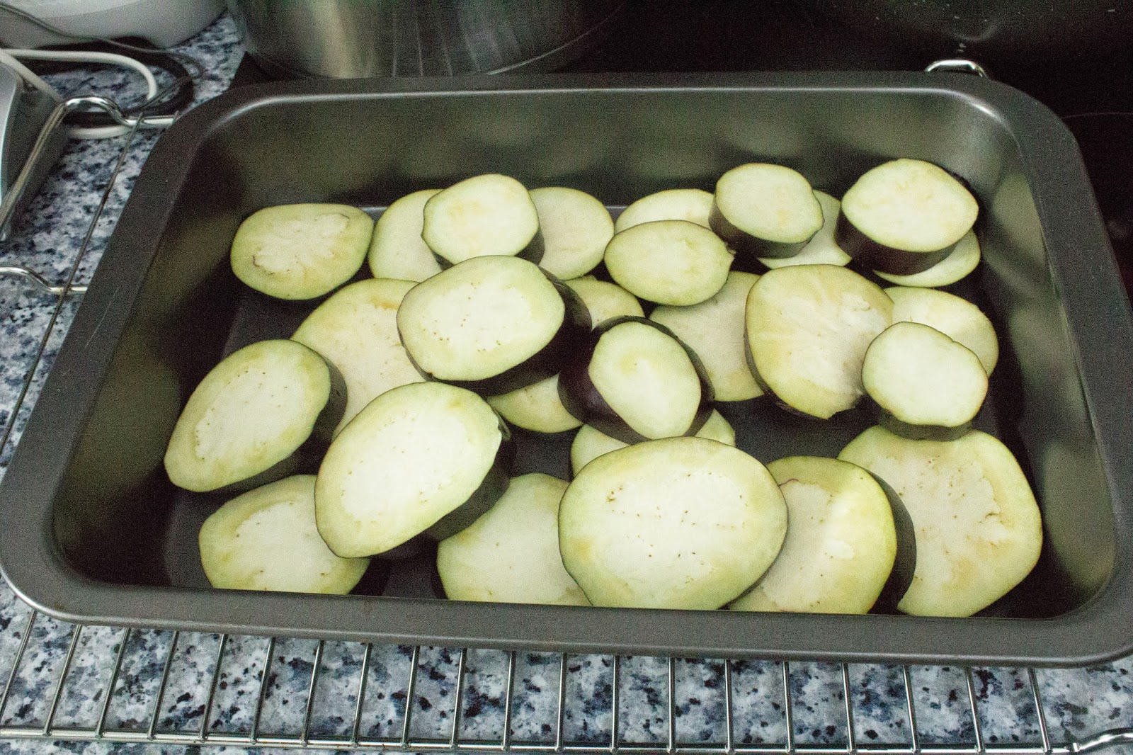Corta las berenjenas en láminas. Yo las hago finas para que se hagan antes pero eso va al gusto.