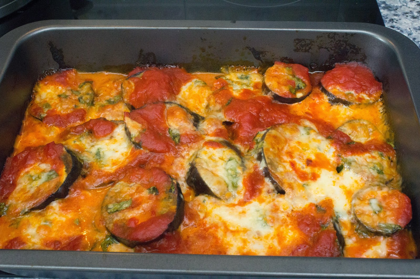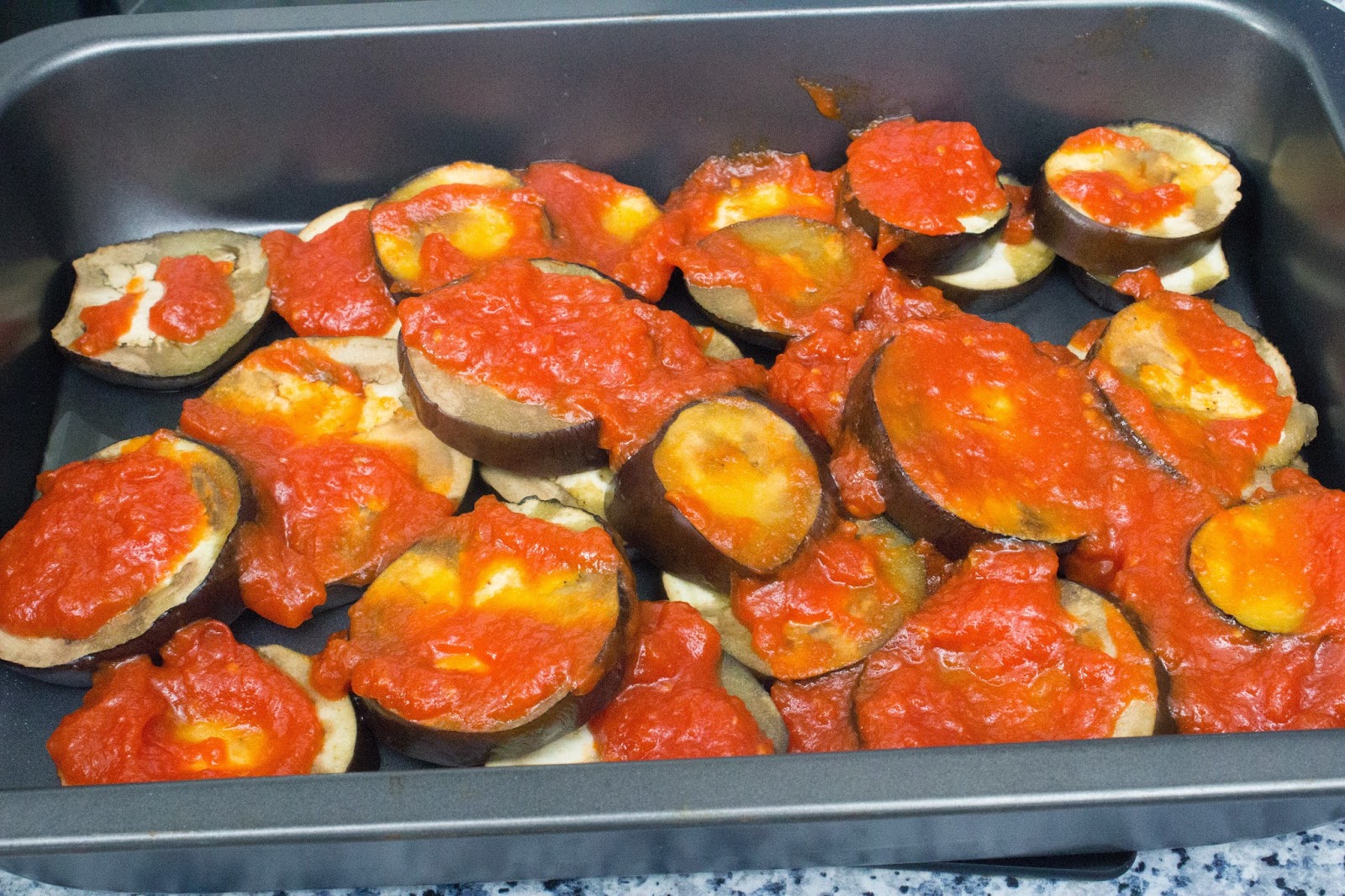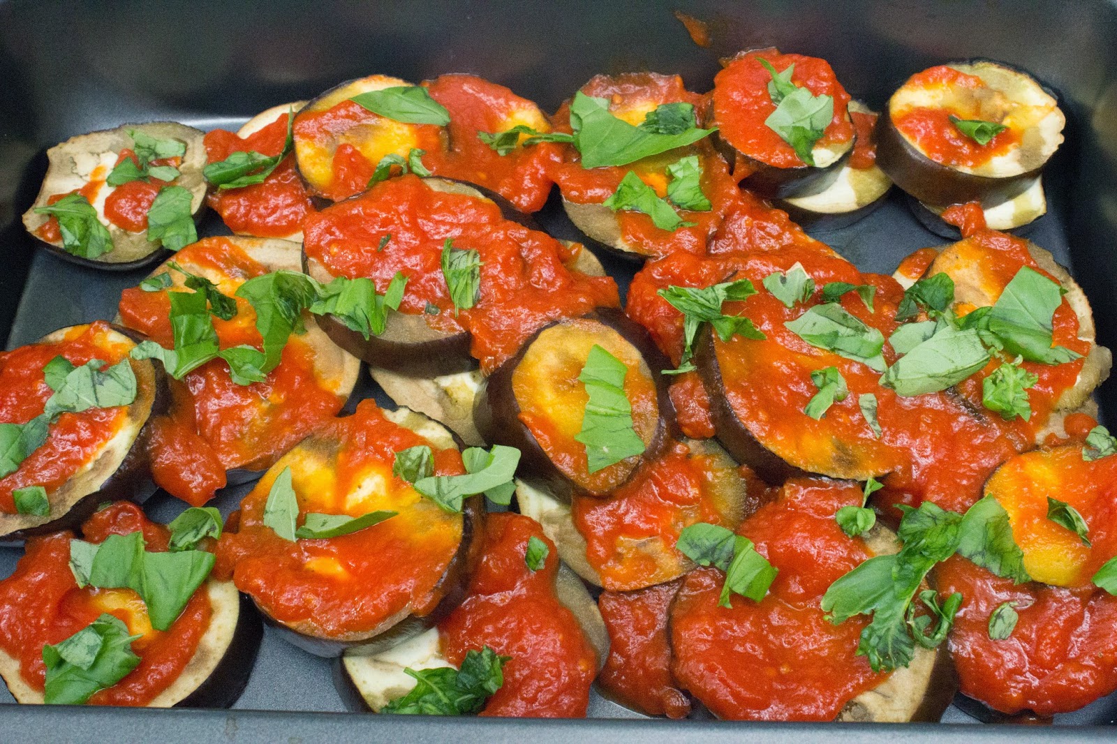 Ingredientes: 2 berenjenasQueso mozarellaAlbahacaTomate fritoAceite