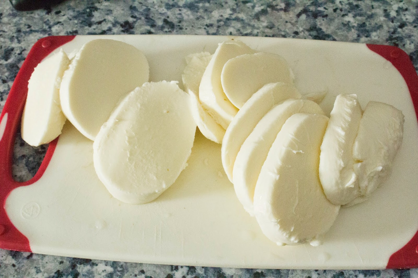 Corta la mozarella en rodajitas y trozos pequeñitos.