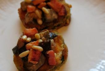Preparamos entonces nuestro aperitivo colocando primero una rodaja de calabacín rebozado y frito, por encima añadimos las berenjenas al Málaga Virgen y le agregamos los piñones con el bacon.