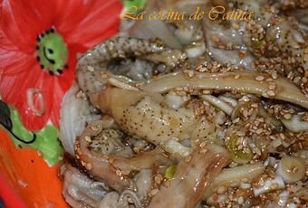 Una vez frías la berenjenas, añadimos las cebolletas y las semillas de sésamo, mezclamos cuidadosamente con el aliño.