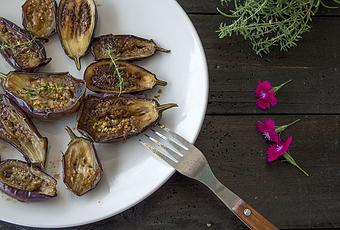 Berenjenas baby sal aceite de oliva virgen extra salsa teriyaki unas ramitas de tomillo