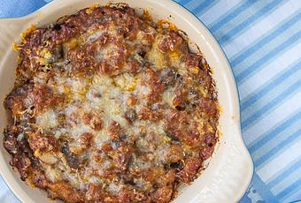 - Opciona: Verter en un recipiente o en bandejas individuales, espolvorear con abundante queso rallado, introducir en el horno y gratinar.