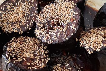 Sacar las berenjenas y decorarlas con unas semillas de sésamo(si el sésamo no está tostado, se puede poner cuando se vayan a llevar al horno). Y listas para servir servir.