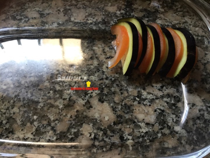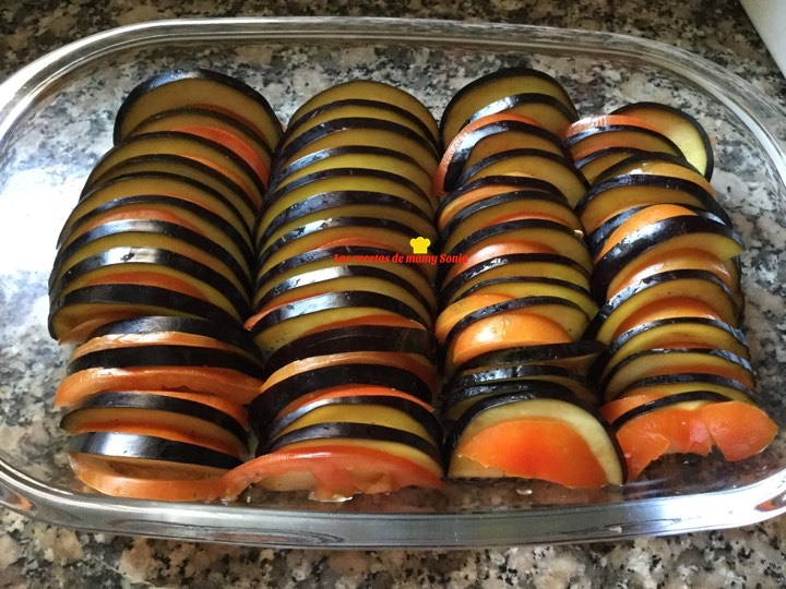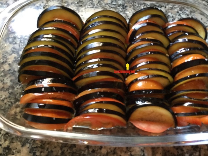 En una bandeja de horno vamos poniendo rodaja de berenjena y tomate alternando