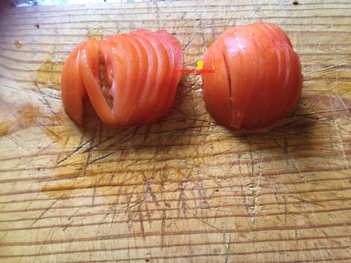 Cortamos las berenjenas en dos y estas en rodajas y los tomates igual