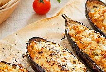 Precalentar el horno a 220º con calor arriba y abajo.Lavar las berenjenas y partirlas por la mitad a lo largo. Hacerle unos cortes en la pulpa a modo de rejilla y espolvorear un poco de sal y pimienta. Untar ligeramente la superficie con aceite y colocar en una fuente de horno. Hornear a 220º durante 35-40 minutos.
