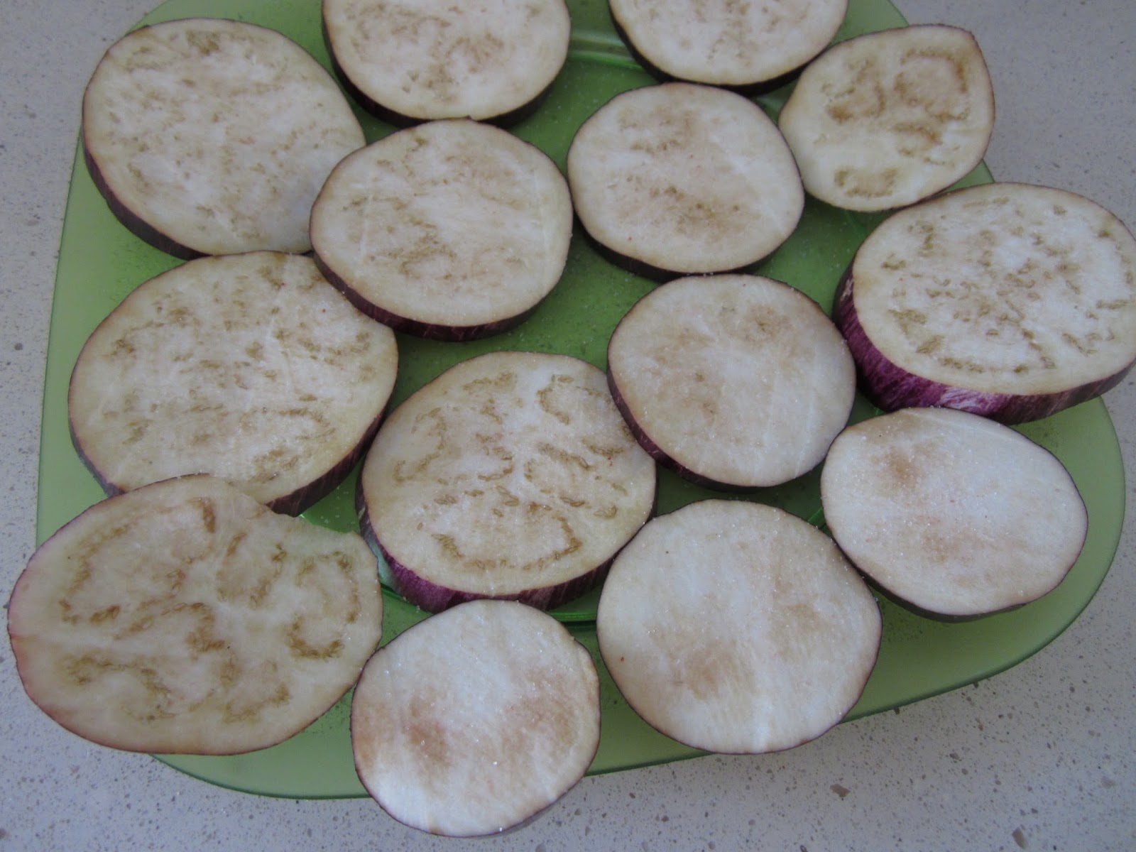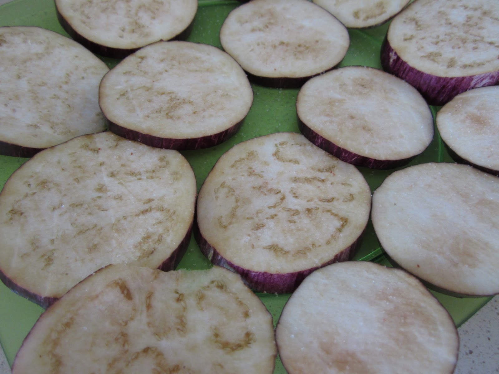 Lo primero que vamos a hacer es hacer “sudar“ la berenjena, la vamos a cortar en rodajas y espolvorear con sal, la dejamos reposar media hora y veremos que salen gotas de la misma.