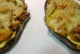 Ahora con una cuchara rellenamos las berenjenas, por encima echamos queso rallado (También podemos echarle bechamel) y volvemos a meterla durante 5 o 6 minutos en el microondas en el modo grill.Y tendremos unas berenjenas rellenas riquísimas y fácil de hacer.