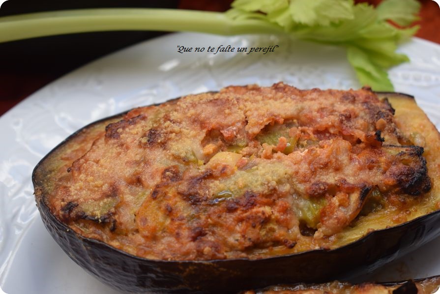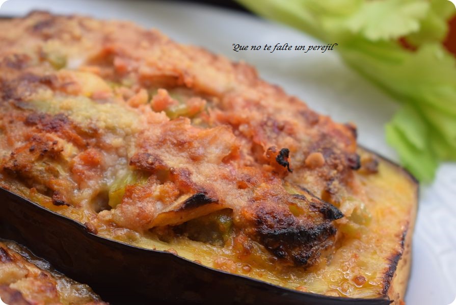Coloca las berenjenas en una fuente o bandeja de horno y gratina hasta que las berenjenas estén tiernas y doradas.