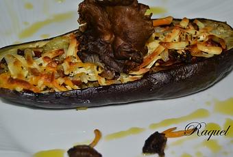 Dos berenjenasUn puñado de CamagrocsDos lonchas de Jamón IbéricoUna cebollaSal y pimientaMezcla de quesos ralladoOréganoRomeroPreparación:Lavamos las berenjenas y las partimos por medio en dos partes, le hacemos unos cortes por la parte de encima le ponemos sal y un chorrito de aceite lo ponemos en una fuente de cristal para microondas, lo tapamos con film transparente y lo pinchamos un poco .Lo metemos a potencia máxima de ocho a diez minutos depende de lo grande que sean.Sacamos y quitamos el film con cuidado de no quemarnos con el vapor, en cuanto se enfríen un poco vaciamos las berenjenas y dejamos solo la cascara de manera que parezcan barquitas.Pelamos la cebolla la partimos a trozos muy pequeños y la freímos, cuando este añadimos la carne de la berenjena también a trocitos pequeños, lo salteamos un poco ponemos un poco de pimienta y un poco de romero.Después limpiamos los Camagrocs y los añadimos, lo salteamos un poco.