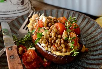 BERENJENEAS RELLENAS CON ENSALADA DE LENTEJAS, HUMMUS, TOMATES CHERRY Y PIMIENTOS