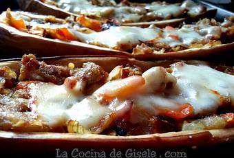 Primero cortamos las berenjenas por la mitad a lo largo y le sacamos la pulpa. Unos lo hacen con cucharilla pero de verdad que es mas facil hacerle unos cortes con un cuchillo y tratamos de sacarla asi. Y al final si co la cucharilla.