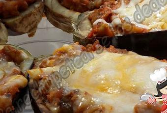 - Échale sal y un poco de aceite a cada mitad de berenjena y ponlas en una fuente o sobre el plato del microondas boca abajo. (Yo las he puesto sobre el plato del microondas, porque no tenía ninguna fuente que cupiera todas las mitades. He puesto sobre el plato film transparente y luego las mitades)- Mételas en el microondas de 6 a 7 min.. a máxima pontencia.- Déjalas enfriar y con una cucharilla vé quitándoles la pulpa con mucho cuidado de que no se rompa la piel, y pícala en trocitos pequeñitos. Ya sea con unas tijeras de cocina o con cuchillo.**Precalentar el horno con el grill que vamos a gratinar..!!- Calentar aceite en una sartén y sofríe la cebolla picadita, échale la pulpa picada de las berenjenas y rehógala bien. Rectifica de sal si hace falta.- Aparta la sartén del fuego y agrégale las dos latas de atún y el tomate frito. Remover para que se mezcle todo.- Agrégale los 2 huevos cocidos picados y mezcla todo.- Ve rellenando cada mitad de berenjena con la mezcla y ve poniéndolas sobre una fuente apta para horno.- Cuando ya las tengas todas rellenas, échale el queso rallado y gratina un par de minutos..