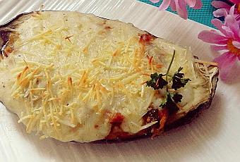 Retiramos el relleno del fuego y rellenamos las berenjenas con la mezcla. Cubrimos con bechamel y espolvoreamos queso rallado. Gratinamos en el horno unos minutos hasta que se funda.