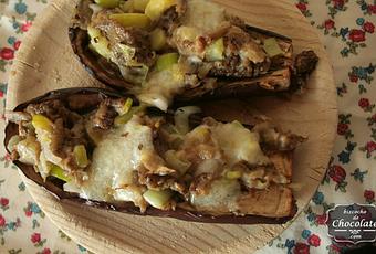 Vaciamos la berenjena, la troceamos y lo mezclamos con el calabacín. Opcional un poco de queso por encima y al horno.