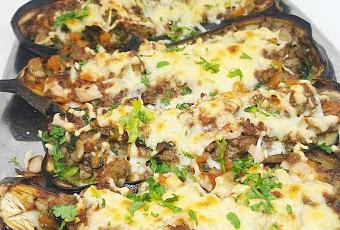 Ponemos el horno en modo "gratinador" y rellenamos las berenjenas con toda la mezcla. Coronamos con queso para fundir o queso rallado al gusto y las dejamos en el horno unos minutos. Sabréis que ya están cuando el aspecto del queso sea dorado y estéis salivando a más no poder.